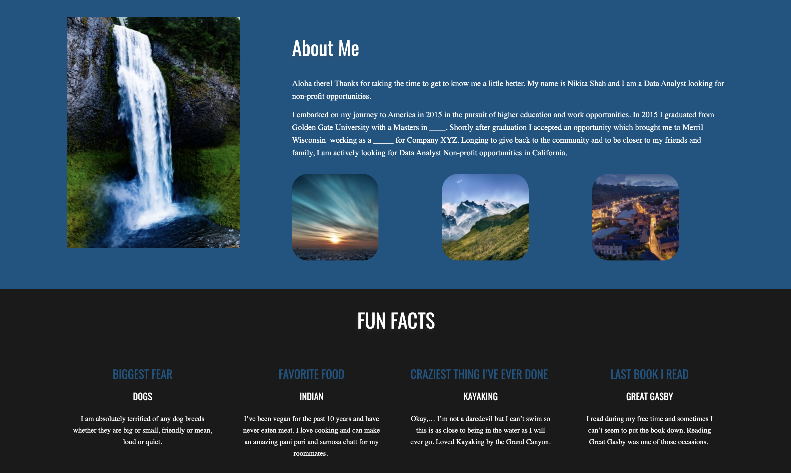 In Progress: Creating personal website for friend Nikita Shah to aid in her job search for Data Analyst roles at a non-profit organization.
